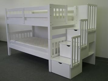 Stairway Bunk Bed Twin over Twin in White with 3 Drawers Built in to the Steps,Bedz King,BK901-White,BK901-White