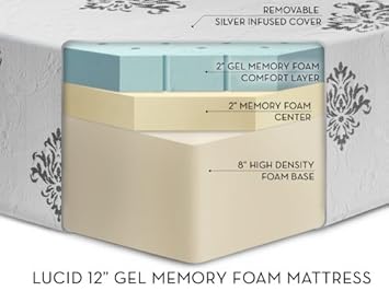 12" LUCID by LinenSpa Gel Memory Foam 4lb Ventilated Memory Foam Triple-Layer Plush Viscoelastic Mattress with Silver-Infused Cover 25-Year Warranty, KING,Lucid,LU12KK45GF