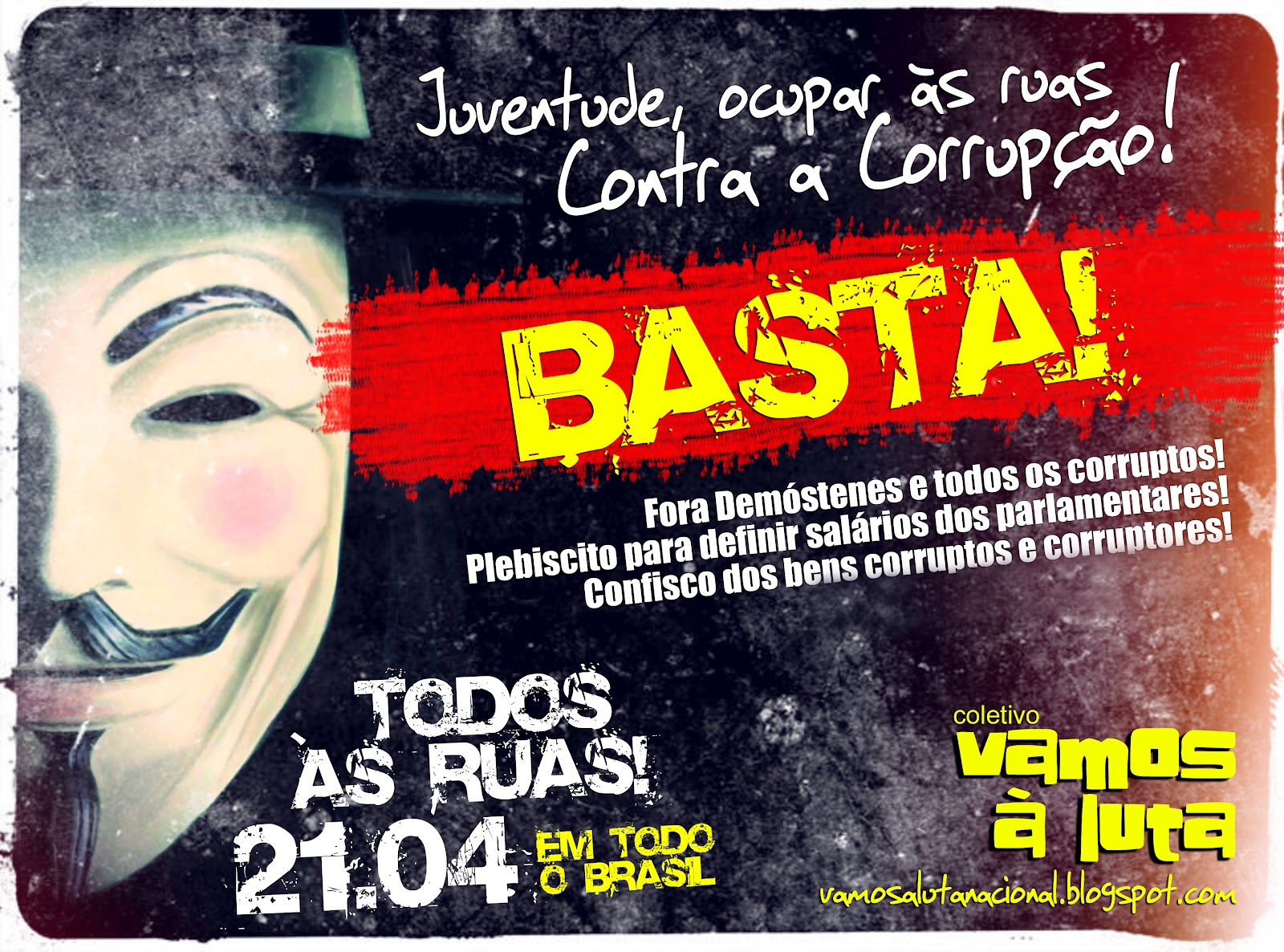 É hora de mudar! No próximo dia 21/04, ocorre em todo o país o dia do Basta! Ocorrerão protestos em diversas capitais exigindo o fim da corrupção, cujos organizadores exigem o voto aberto, a transformação da corrupção como um crime hediondo e o fim do foro privilegiado. É a hora de exigirmos punição aos corruptos que saqueiam os cofres públicos e são diretamente responsáveis pelo sucateamento da educação em nosso país. É hora da juventude e trabalhadores irem as ruas denunciar os governos e suas relações promíscuas coma máquina pública.